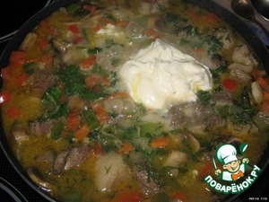 Добавляем сметану, размешиваем и оставляем всё томиться на маленьком огне, накрыв крышкой.