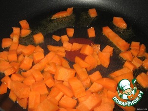Нарезать морковь кубиками и обжарить её на растительном масле.