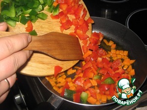 Добавить к моркови перец, нарезанный кубиками.