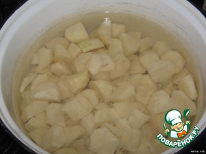 Теперь очищаем картофель, нарезаем его небольшими кусочками. Ставим вариться.