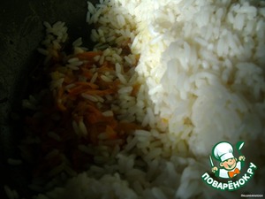 Готовый рис промыть под холодной водой и переложить в сковороду на готовые овощи. -