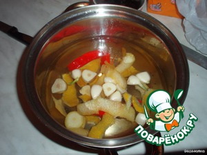 Смешиваем в кастрюльке масло, перец чили, чеснок, цедру лимона, перец горошком - доводим до кипения и кипятим на маленьком огне около 5 мин.