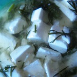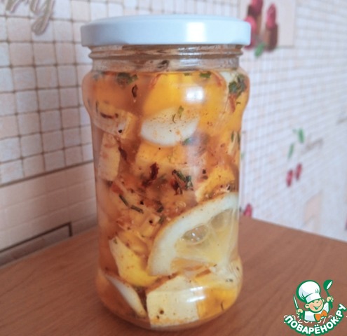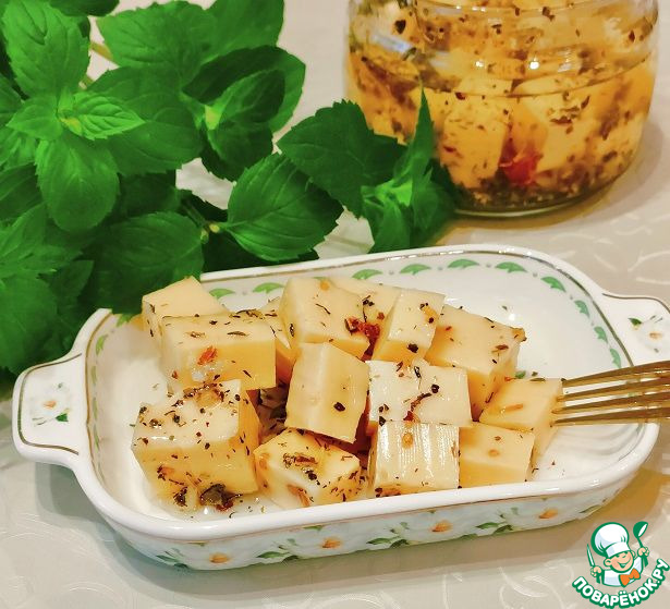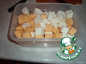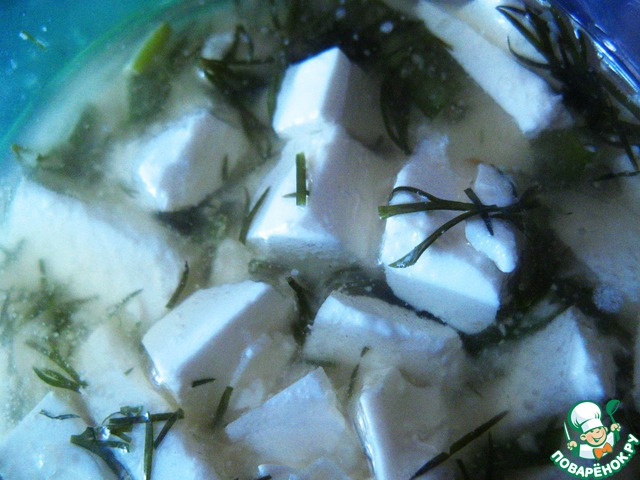Сыр режем кубиками и заливаем его "маринадом". Закрываем крышкой и даем постоять около суток (можно и меньше).