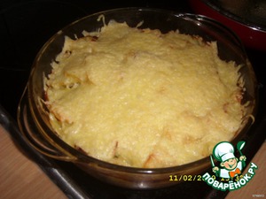 Запекаем в духовке до готовности, посыпаем тeртым сыром и допекаем, пока сыр не расплавится.