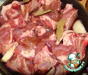 Мясо солим... перчим.. добавляем любимые специи для мяса... лавровый лист... заливаем вином... и убираем для маринования на 12 часов -