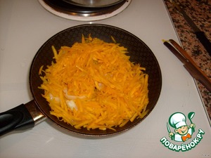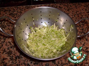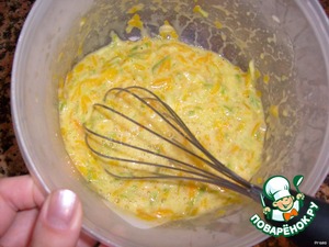 Потом добавляем лук и тыкву, из кабачков выжимаем жидкость и тоже добавляем, солим, перчим по вкусу и перемешиваем