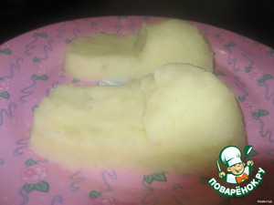 На плоскую тарелку кладём две небольшие "кучки" картофельного пюре и с помощью ложки формируем "тапочки". -