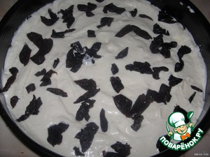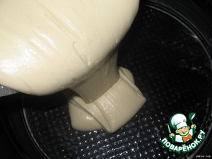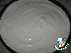Выливаем тесто в смазанную сливочным маслом форму (форма должна быть разъёмной, либо такого же диаметра, как разъёмная, так как собираться торт будет именно в ней).
