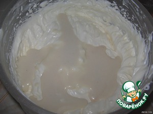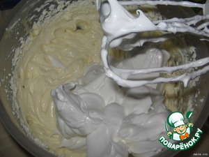 Отдельно взбиваем белки с оставшимся сахаром в крепкую пену. Добавляем их в массу и немного взбиваем.