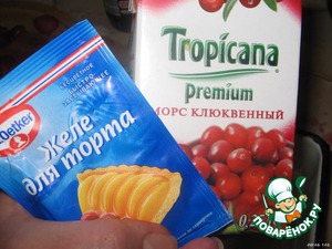 Делаем желе. Его можно купить готовое в пакете и приготовить по инструкции (если будете делать так, наливайте воды меньше, чем указано, как правило, желе в таких пакетах плохо застывает), а лучше взять готовую смесь "Желе для торта" и, смешав её с любым, но только прозрачным, соком, залить верх торта.