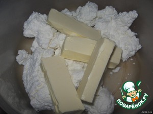 Творог растираем с размягчённый сливочным маслом (150 гр).