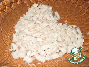 Куриную грудку отварить, охладить, нарезать кубиком и выложить на тарелке в форме сердца.