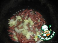 В посуду налить растительное масло и обжарить сначала колбасу, а затем добавить лук