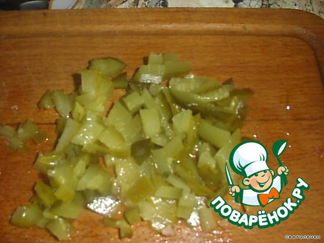 Мелко нарезать огурец (у меня солёный) и добавить к колбасе с луком |