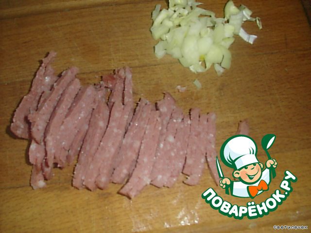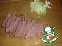 Копченую колбасу нарезать мелкими полосками, нашинковать лук. |