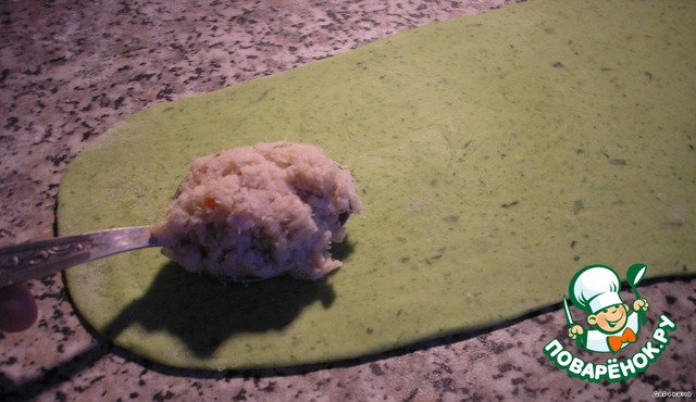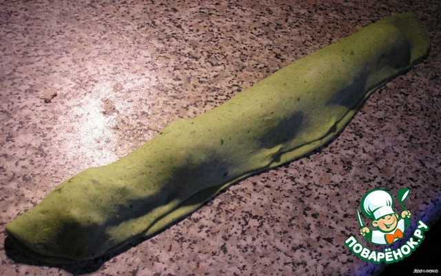 Замесим тесто: мука + 1 стакан холодной воды + пюре из петрушки + 2 щепотки соли + масло.