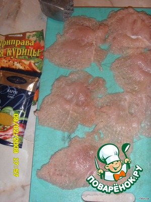 Каждое филе отбить по краям, тонко, но оставив серединку не тронутой. Приправы идут те, которые вы любите. Посыпала карри, приправа для курицы