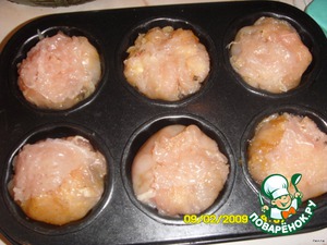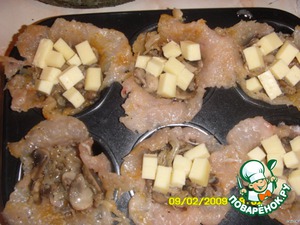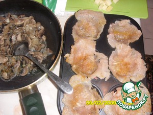 Филе выкладываем в форму так, чтоб неотбитая часть оказалась на дне.