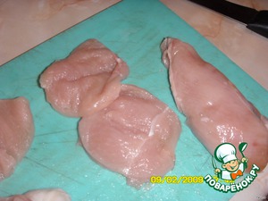 Количество филе зависит от кол-ва порций, так как у меня формы маленькие, то разрезала грудинки