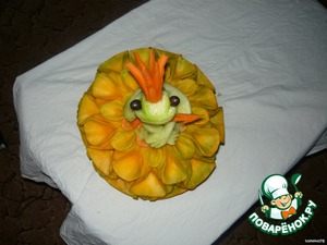 Любимые работы моего мужа. Лягушка сделана из зеленой редьки, корона - из моркови, цветок, на котором сидит лягушка - из тыквы