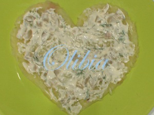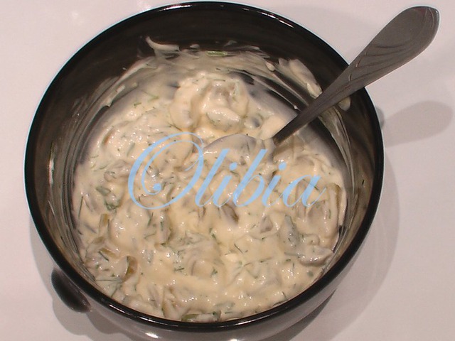 Соус: нарезать мелко соленый огурец (1 или 2), добавить майонез и рубленый укроп, тертый на мелкой терке чеснок, поперчить и все перемешать. Не бойтесь добавлять чеснок, 2 зубчика - это не много, да и чеснок считается одним из афродизиаков. -