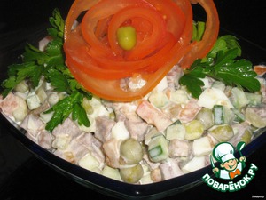 Каждый год, в первую субботу февраля, мы встречаемся с одноклассниками... Нет, в баню мы не ходим, ))) но какой-нибудь ресторанчик посещаем! Так вот, я к тому, что салатик этот из ресторана, т. е. его рецепт. Хоть с памятью уже была беда, но состав я запомнила, а утречком, не без труда, конечно-же, вспомнила и дрожащею рукой записала. Воспроизвожу...