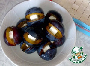 Начиненную кусочками сахара сливу ставим в микроволновую печь в подходящей посуде, накрываем колпаком для защиты микроволновки от брызг, ставим на мощность 800 Вт из расчета 15-18 секунд на одну сливу