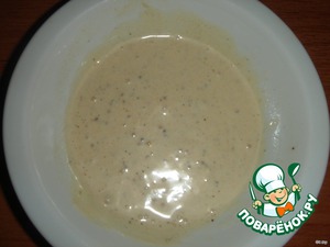 Приготовить соус, смешав сметану, майонез, два вида горчицы, уксус и перец.