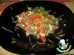 Выкладываем на тарелку (у меня - порционно), украшаем цедрой лимона, зеленью и оливками. Салат готов!!!