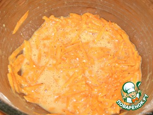 Берем кусочки грудки, обмакиваем их в яично-морковную смесь и кладем на сковородку с разогретым растительным маслом (при этом морковка окажется с двух сторон, она как бы прилипает к кусочку мяса).