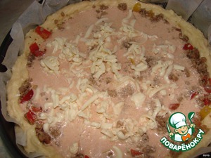 Делаем заливку: смешиваем молоко, сливки и томатную пасту, выливаем на фарш. Я еще натерла плавленный сыр сверху.