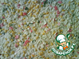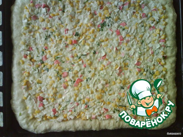 Этот пирог для тех, кто любит сочетание крабовых палочек, кукурузы и риса.