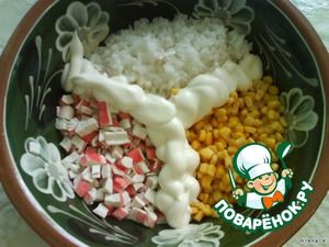 Крабовые палочки режем, соединяем с отварным рисом и кукурузой, заправляем яичной смесью.