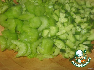 Сельдерей нарезать небольшими кусочками, огурцы нарезать кубиками.