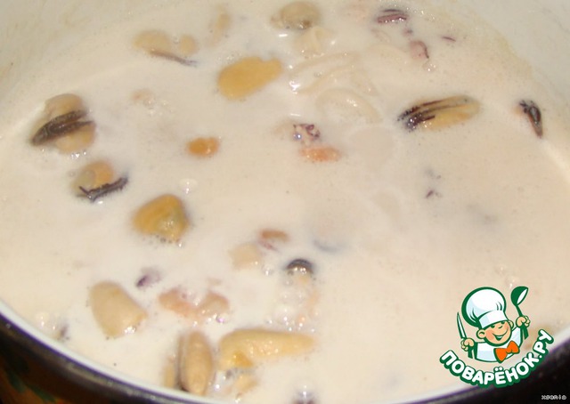Выкладываем ассорти в кастюлю... заливаем вином и варим 8 минут... Затем чуть соли... перца... и вливаем сливки...