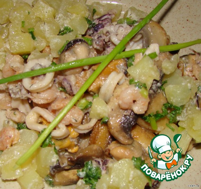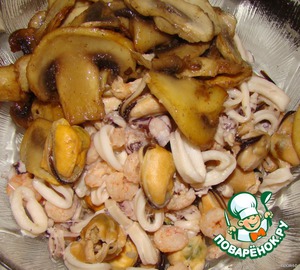 Смешайте шампиньоны с морепродуктами и оставьте остывать