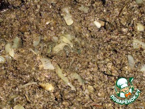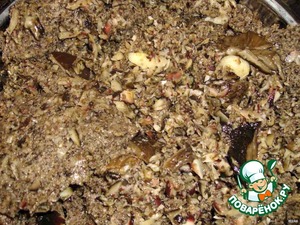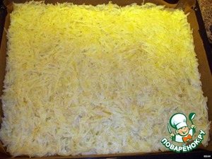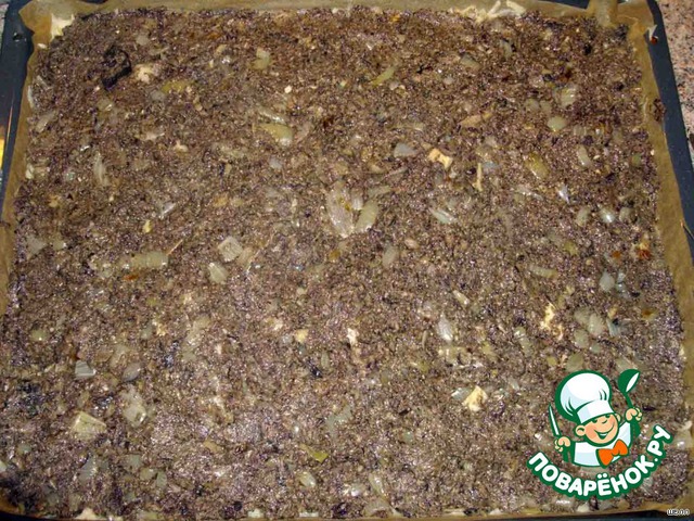Лучше брать форму с высокими бортиками, чтобы влезло несколько слоев, например, 3 слоя катрошки и 2 слоя грибов. Моя ошибка - противень, не такой высокий получился тортик. -