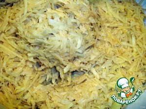 В картофель добавляем крахмал, яйца, соль - тщательно перемешиваем.