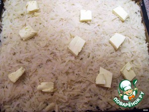 Противень или форму застилаем бумагой, смазываем растительным маслом. Выкладываем слой картофеля.