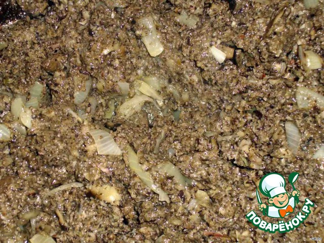 Смешиваем лук и грибы и еще обжариваем несколько минут -выпариваем влагу.