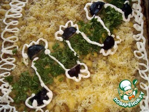 Достаем из духовки и украшаем зеленью, грибами, сыром и майонезом.