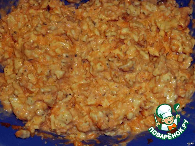 Сырую морковь и плавленные сырки трем на самой мелкой терке. Перемешиваем, добавляем майонез, мелко нарезанную зелень, выдавливаем чеснок.