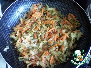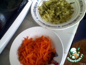 На отдельной сковороде обжарить на растительном масле до золотистого цвета лук, добавить морковь, потушить. Добавить огурцы и томатную пасту.