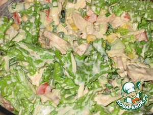 [b]Соус:[/b] смешиваем майонез, сливки, горчицу (готовую, не порошок) и соевый соус до однородности. И заправляем соусом салат.