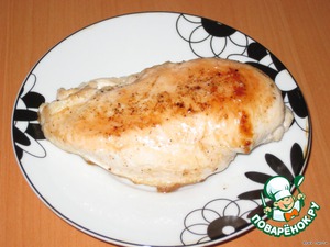 Куриную грудку обжарить на растительном масле с двух сторон, посолить, поперчить.