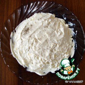 Выложить слои на блюдо: кальмары, яйца, сыр. Смазать майонезом. Посыпать черным перцем.