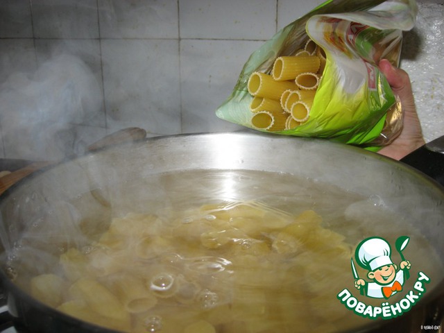 Если Вы еще помните, то к этому времени вода на макароны должна уже закипеть. Значит, бросаем макароны. Варим до готовности, но не перевариваем. Как говорят итальянцы: "макароны лучше не доварить, чем переварить"