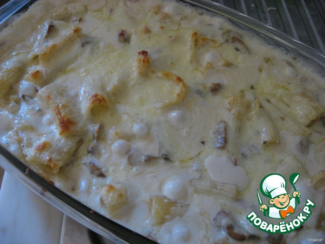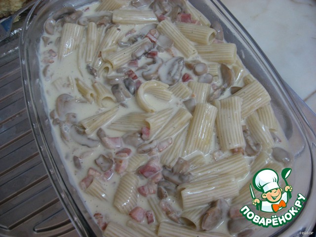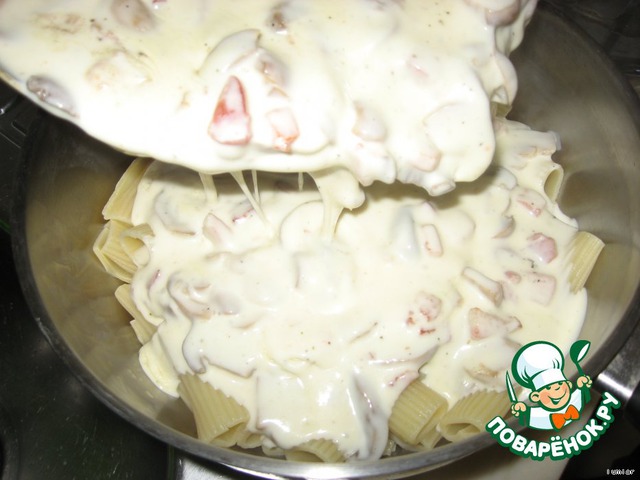 Сваренные макароны (а к этому времени они должны свариться, по крайней мере, у нас так вышло) откидываем на дуршлаг, возвращаем в кастрюлю и заливаем соусом (уже не только из бешамеля и сливок, но и из бекона и грибочков)