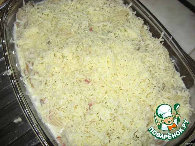 Перемешиваем и выкладываем в форму, посыпаем тертым сыром и - в духовку для того, чтобы сыр расплавился, минут на 10-15