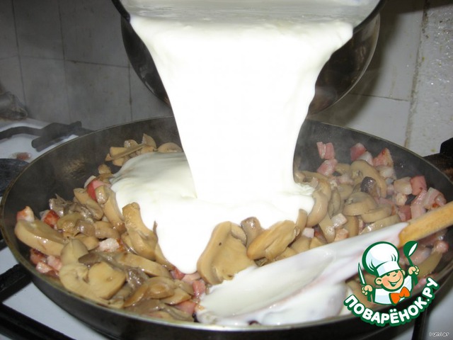 В это время выливаем бешамель и сливки в кастрюльку.